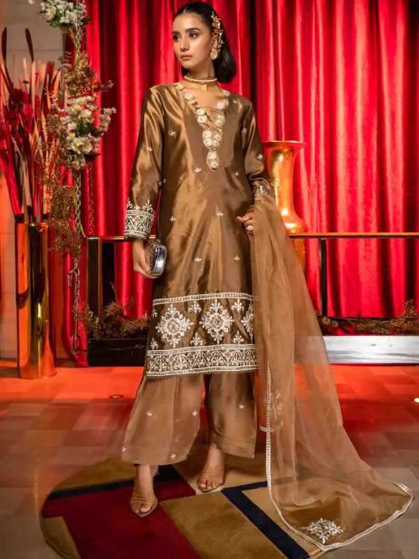 n sand-colored sheesha silk, this long silhouette is adorned with statement 3D sleeve patterns encrusted with stones,...